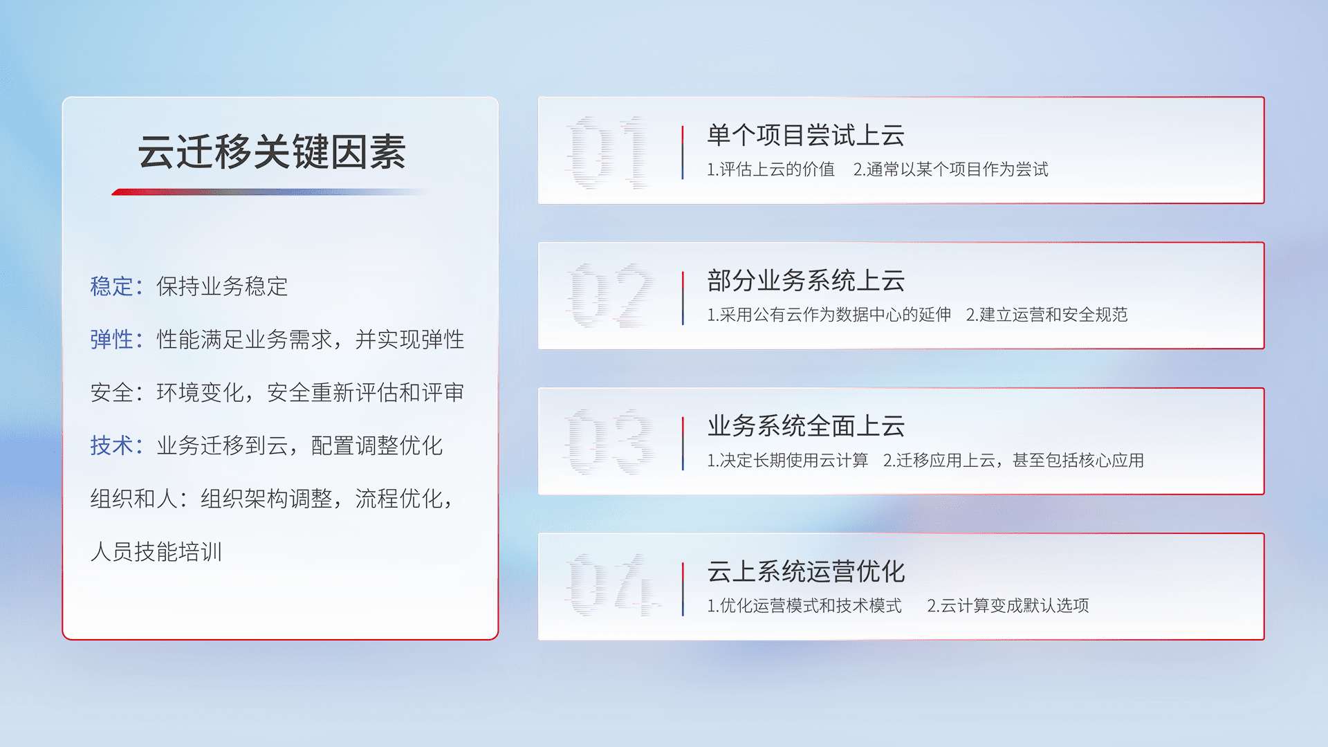 结合实际业务,,,从规划设计、、、云平台选型、、、、云原生改造、、、、数据迁移、、、、集成交付,,,迁移全过程为客户识别最佳上云路径,,,,做好风险识别管理,,,,设计网络架构、、身份权限、、、、安全审计合规、、、操作审计、、、、日志审计、、、、监控告警策略、、、、多站点容灾设计等,,,,对云上基础设施进行整体规划,,提升IT治理水平,,以满足弹性、、、高可用、、、高性能的需求。。。。