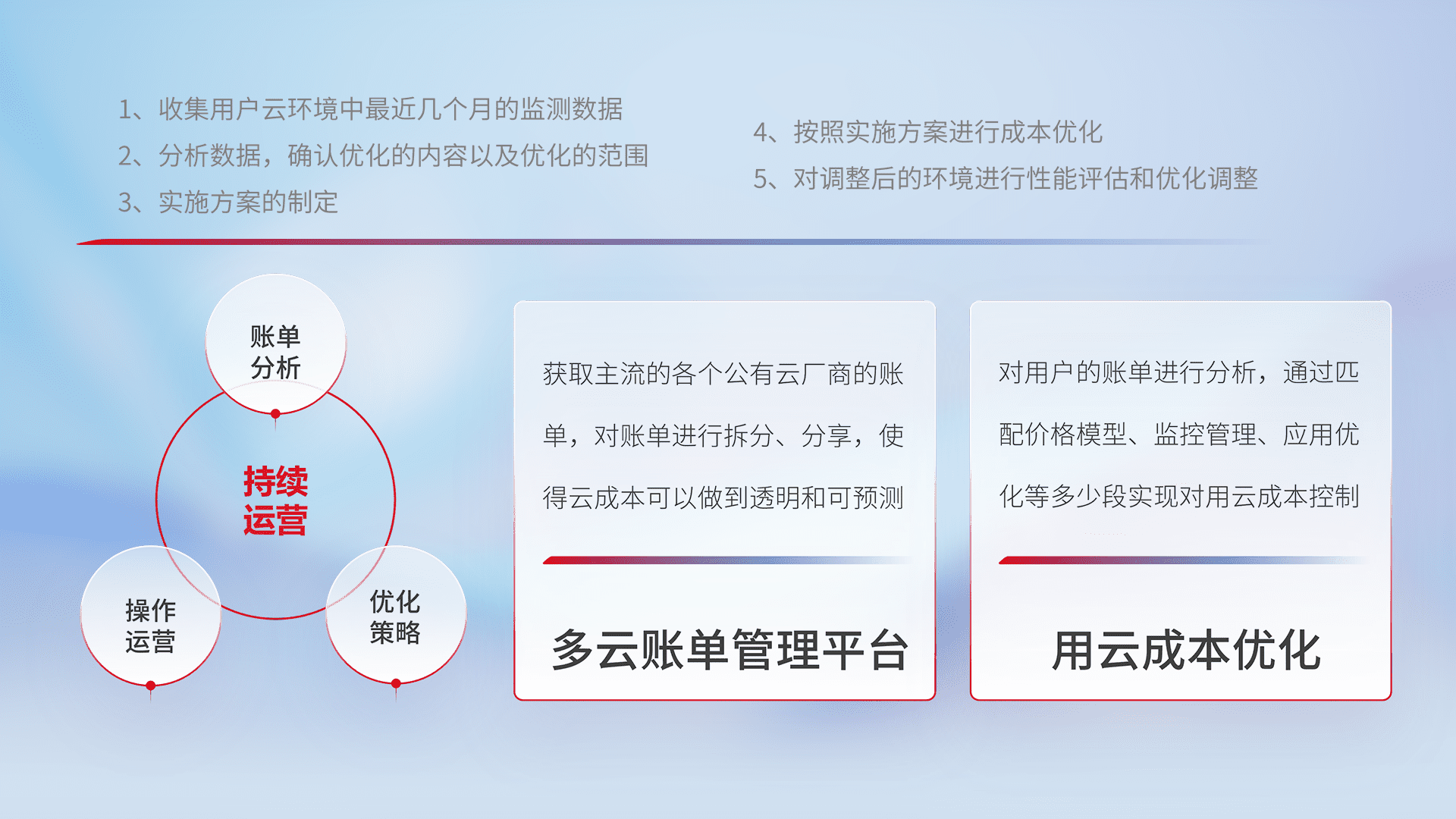 通过多云纳管,,以统一的资源数据模型把客户的云资源进行抽象和封装,,进而实现对多云资源的统一操作,,,,保障云资源管理的可靠性、、稳定性与可用性。。。量身定制化运维内容,,,,配置、、、、开发运维、、、、补丁管理、、、、备份、、监控、、、、认证和访问管理、、审计和日常巡检等,,保障在用云过程中的可靠度,,,稳定度以及高可用率。。。